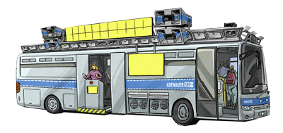 Für den Einsatz wird eine Stellfläche für einen 12 Meter langen und ca. 4 Meter hohen Bus benötigt. Zusätzlich wird vor dem Bus eine Ausstellung aufgebaut, für die etwa 60 m² Fläche eingeplant werden sollten. Ein Stromanschluss ist hilfreich, aber nicht zwingend erforderlich. Idealerweise findet der Besuch auf dem Schulhof oder einer vergleichbaren, gut zugänglichen Fläche statt.