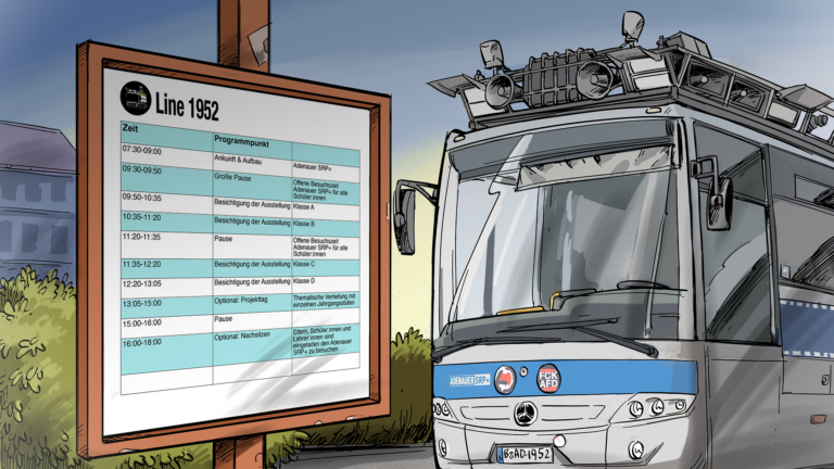 Als Lehrkraft, Eltern, Engagierte oder Schulleitung können Sie den Adenauer SRP+ Bus hochoffiziell oder anonym einladen. Wir bieten ein modulares Programm zu Demokratie, Menschenrechten und Gefahren rechtsextremer Ideologien – flexibel an Ihren Stundenplan anpassbar.
