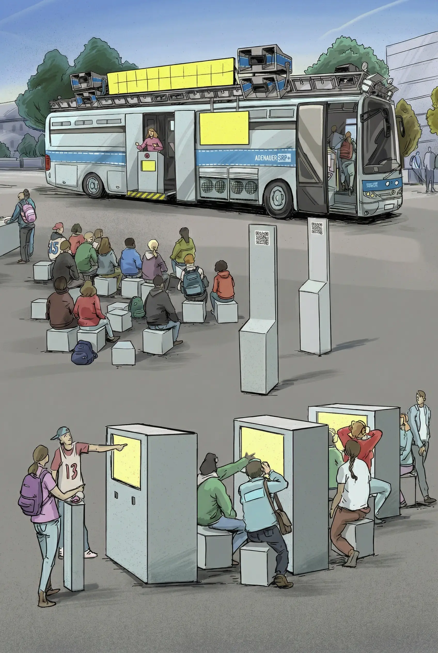Kommt der Adenauer SRP+ an deine Schule, bekommt ihr eine exklusive Tour von unserem Team durch den Bus. Außerdem bauen wir für euch, auf eurem Schulhof, eine interaktive Ausstellung auf! Du hast Fragen zum AfD-Verbot oder zu Migration und Rassismus? Mit kurzen Videos zu Themen wie Migration und Rassismus, Rechtsextremismus und wehrhafte Demokratie wird aus unterschiedlichen Perspektiven zu den Themen aufgeklärt.